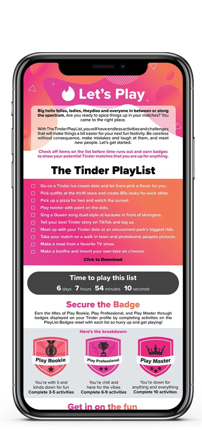 A list is ten activities that refresh every two weeks, encouraging users to get out into the world and try things they may not normally do. Users can participate to earn badges for their Tinder profile, be featured on social media, or just kick it with. a new match.